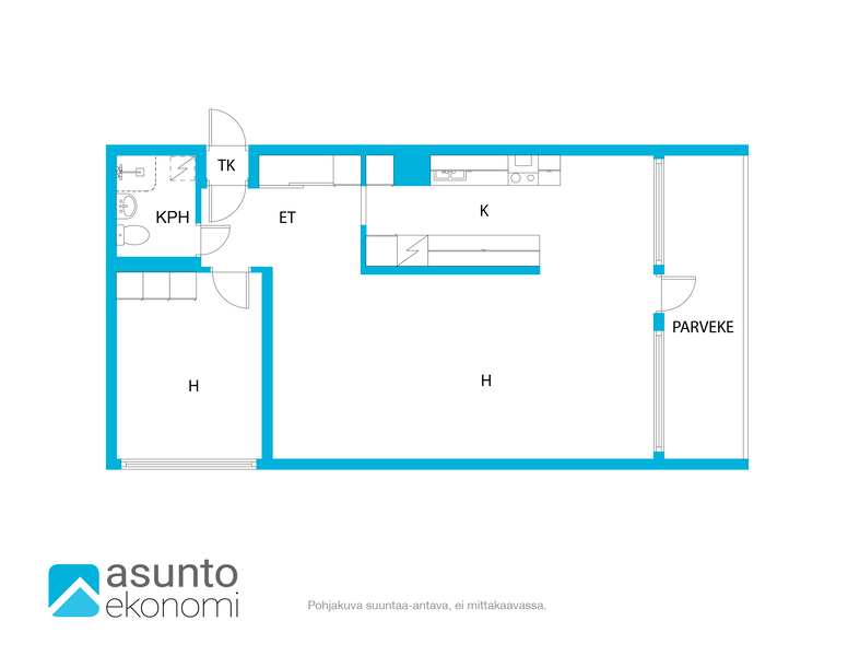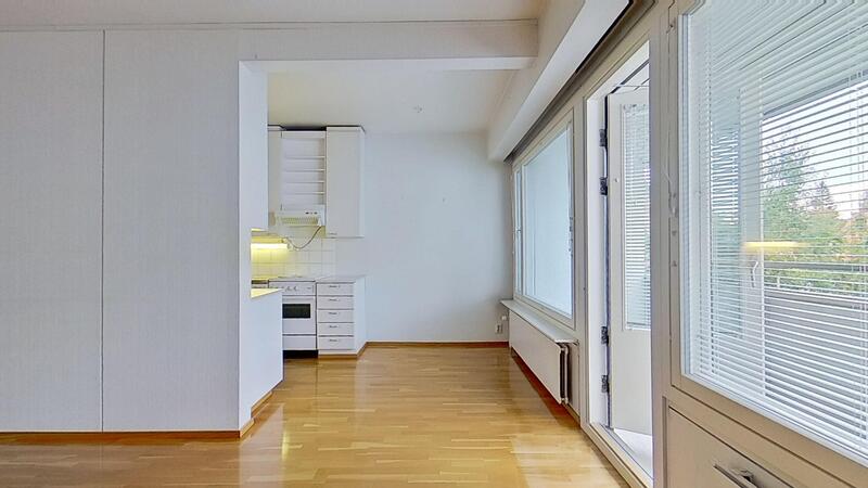 Toimivapohjainen huoneisto koostuu tilavasta olohuoneesta, erillisestä keittiöstä, jonka ruokailutila on yhteydessä olohuoneeseen sekä makuuhuoneesta, jossa on runsaasti säilytystilaa. Olohuoneesta on käynti etelään suuntautuvalle parvekkeelle. Keittiö on varusteltu jääkaappi-pakastimella, sähköliedellä ja liesituulettimella. Keittiön kaapistot on uusittu arviolta 2000-luvun taitteessa.
