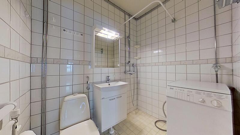 Kylpyhuone on laatoitettu ja siisti, varustettuna wc-istuimella, suihkulla ja pesukoneliitännällä. Kylpyhuoneessa on peilikaapisto ja 2025 uusittu allaskaapisto. Huoneistossa on parkettilattiat (makuuhuoneessa muovimatto) ja tapetoidut seinäpinnat, ja eteisessä käytännöllinen peililiukuovikaapisto.