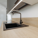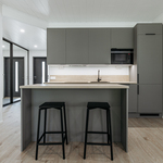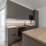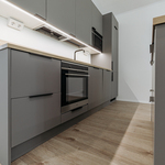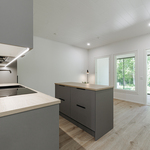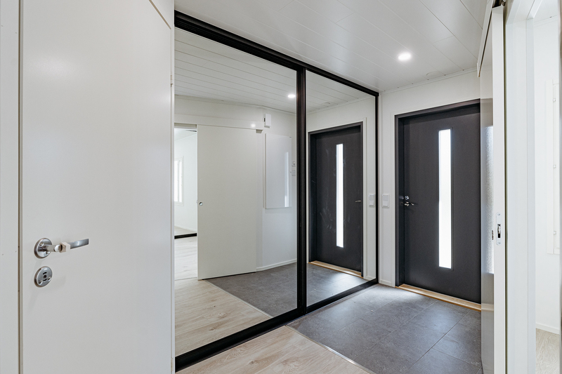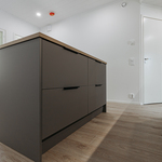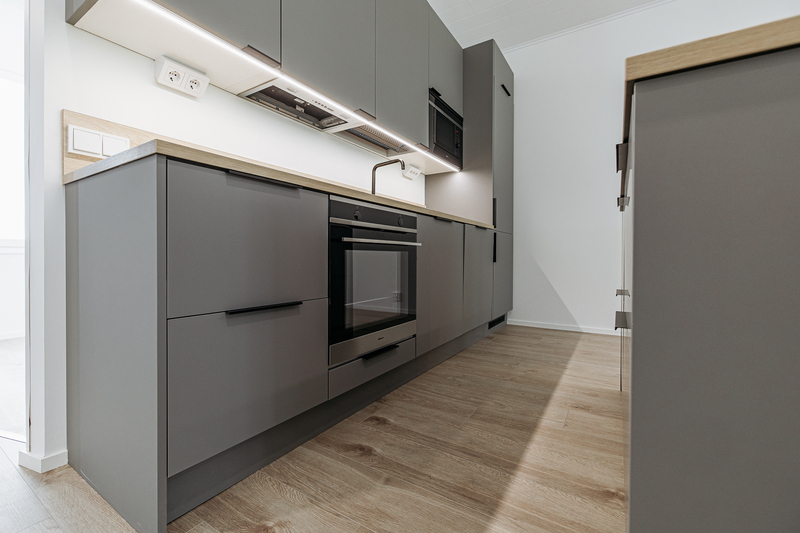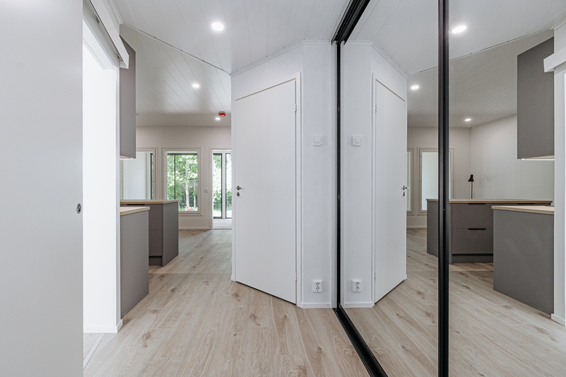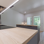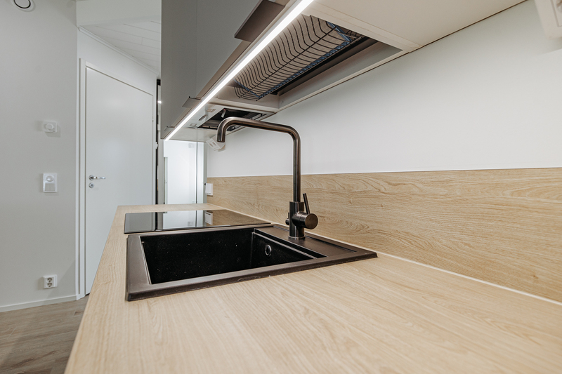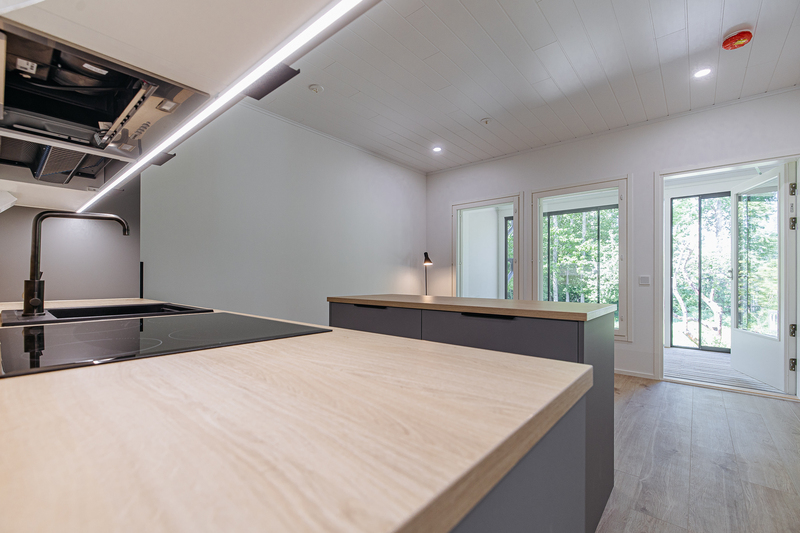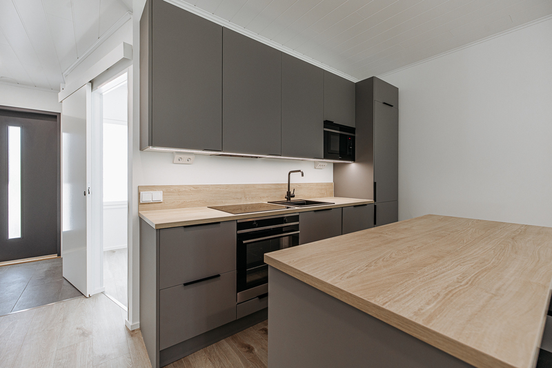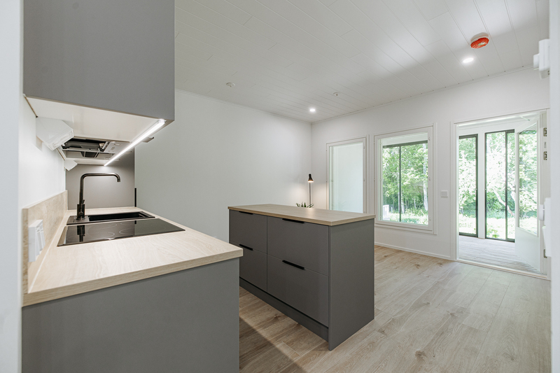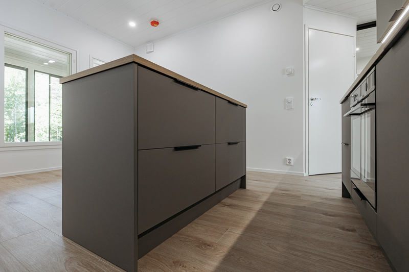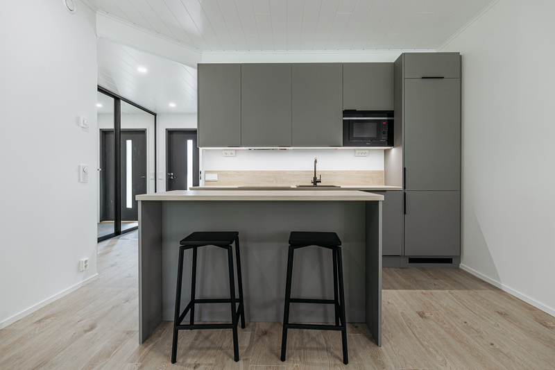 Keittiön varustelu Lattiamateriaali valittavissa parketti tai vinyyli. Seinissä maali, välitilassa levy. Tasot laminaatti.Kalusteisiin integroitu astianpesukone ja mikroaaltouuni, jääkaappi/pakastin, induktioliesitaso, erillisuuni, liesituuletin.Keittiöön on lisätilauksesta saatavilla saareke.