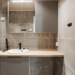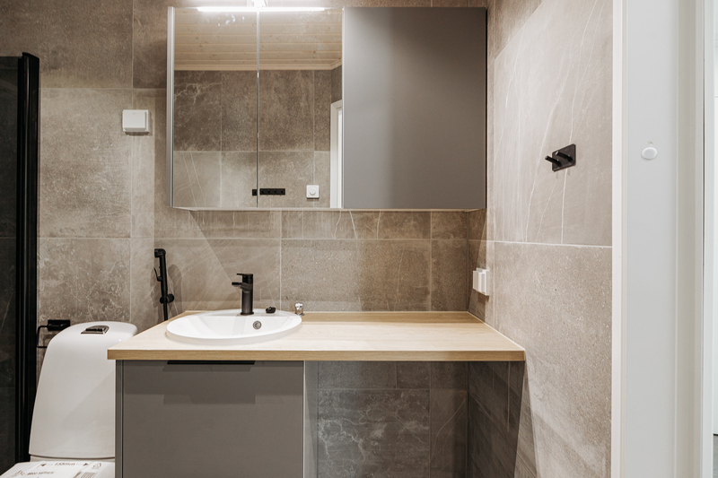 Kylpyhuoneen kuvaus Laatta/kaakeli.Peilikaappi, allaskaapisto, pesukoneliitäntä, suihku, suihkuseinä, lattialämmitys.