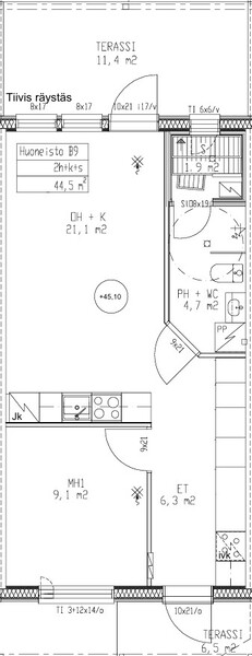 Pinta-alojen lisätiedot Yhtiöjärjestyksen mukainen huoneistoselitelmä ja pinta-ala: 2H+k+PH+S, 44,50 m2. Muut tilat lasitettu terassi 11,4 m2.