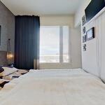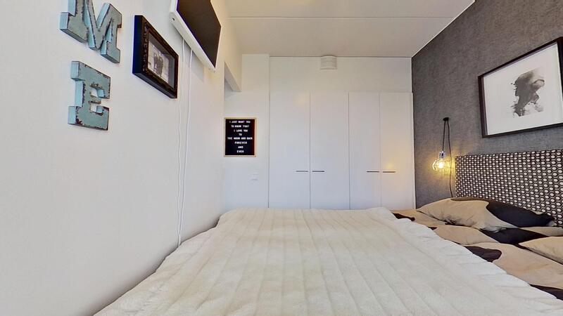 Makuuhuoneeseen on kaksi käyntiä molemmilta puolin olohuonetta. Makuuhuoneessa on tilaa säästävät seinään upotetut kaapistot.