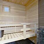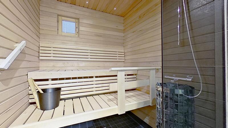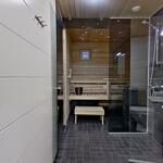 | Saunan kuvaus | Saunassa katon tunnelmavalaistus, Harvian pilarikiuas ja tyylikäs tumma lasiseinä. |