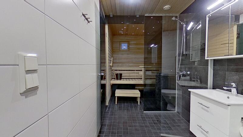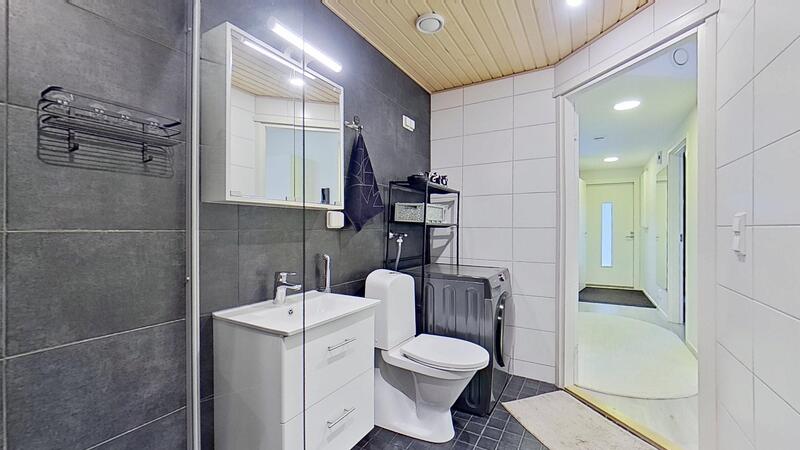 | Kylpyhuoneen kuvaus | Tyylikäs kylpyhuone. Katossa kiinteä led-valaistus. Varustus: pesukoneliitäntä/pesutornimahdollisuus, lattialämmitys, wc-istuin, suihku, taitettava suihkuseinä, peilikaappi ja allaskaapisto. Lattia: laatta. Seinät: kaakeli. |