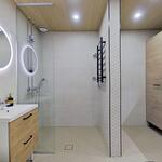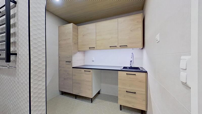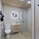 | Kylpyhuoneen kuvaus | Pyyhekuivain. Kylpyhuoneessa seinällä erotettu kodinhoitotila, jossa kaapistot, laskutaso ja lavuaari. Pesuhuoneessa huurtumaton peili(vastukset). Varustus: pesukoneliitäntä, lattialämmitys, wc-istuin, suihku, kylpyhuonekaapisto. Lattia: laatta. Seinät: kaakeli. |