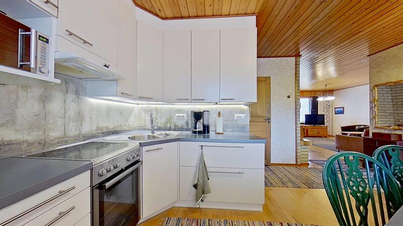 Asunnon pohjaratkaisu on selkeä ja muunneltava. Valoisa olohuone on varaavalla takalla varustettu. Takka toimii kodin sydämenä ja luo lämpöä sekä tunnelmaa ympäri vuoden. Olohuoneesta avautuu luonteva yhteys ruokailutilaan, joka on helposti otettavissa käyttöön toiseksi makuuhuoneeksi. Keittiö on siisti ja uusittu kauttaaltaan noin vuonna 2010. Keittiön mitta-asennettu pöytä on tiskitasojen kanssa samaa sarjaa ja sisältyy kauppaan.