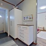 WC-tilojen kuvaus Peili, allaskaapisto. Wc -istuin uusittu 2024. Wc-kalusteet uusittu arviolta 2000-luvun alkupuolella.