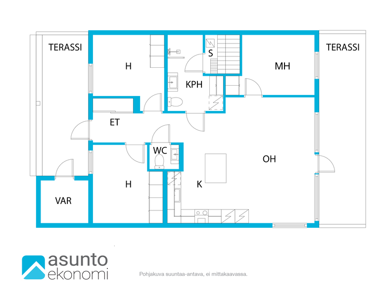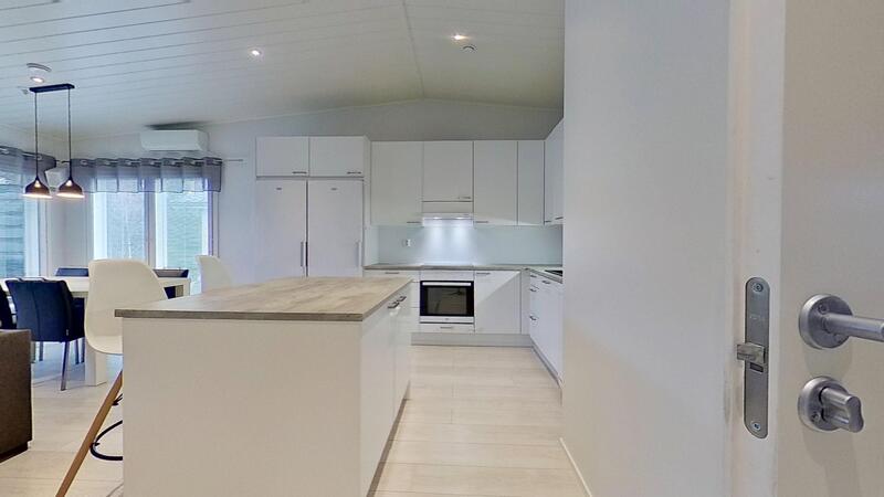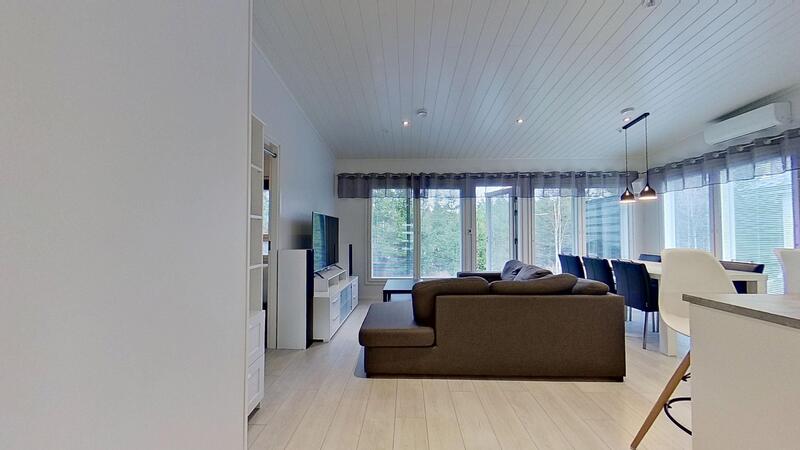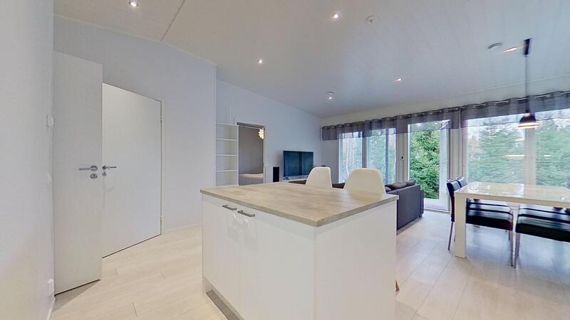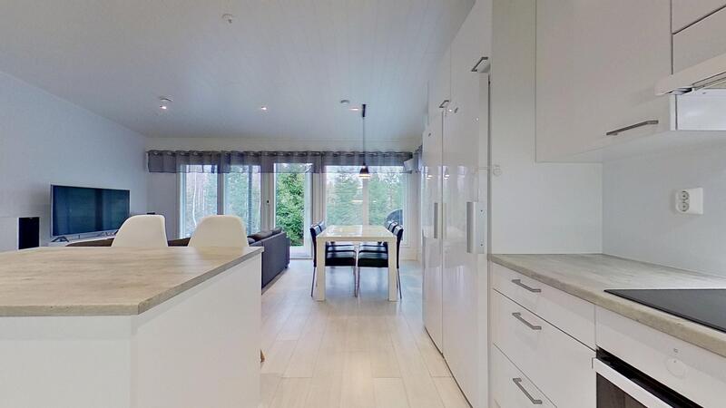 Toimiva ja valoisa pohjaratkaisu tekee arjesta sujuvaa. Huoneiston kuivissa tiloissa on kauttaaltaan korotetut sisäkatot. Avaran olohuoneen yhteydessä on moderni saarekkeella varustettu keittiö. Olohuoneen suuret ikkunat tuovat tilaan runsaasti luonnonvaloa. Päänäkymä olohuoneesta suuntautuu suojaisan metsikön suuntaan. Olohuoneen viilennystoiminnolla varustettu Ilmalämpöpumppu pitää huoneiston lämpötilan miellyttävänä kuumimpinakin hellejaksoina. Kodin molemmilla puolilla on katetut terassit, jotka tarjoavat vaihtoehtoja auringosta nauttimiseen ja rauhalliseen oleskeluun.